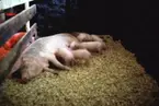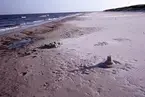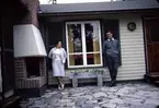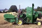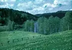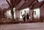 Jordbearbetning med två hästar och harv vårtid. På intilliggande mark går en man och sprider kalk för hand. Mjölkflaskorna har troligen återkommit efter att de har varit och tömts på ortens mejeri.