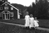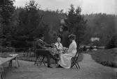 Tre personer står på en veranda, bakom dem är ett skynke upphängt som bakgrund. Personerna på bilden är Karl och Elisabeth Möller samt en av deras söner. Familjen Möller tillbringade många somrar på Gustafsberg och Elisabeth var även där som barn.