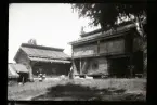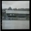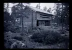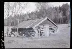 Fotografens anteckning: Dito gård (Karl Anton Holmbergs gård) en gammal "bastu" som "dom har torkat korn i" + hustru Josefina H. (Holmström).