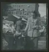 Människor framför ett marknadsstånd som säljer dockor och dockkläder. Skansen, Stockholm.