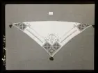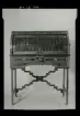 Ett målat fat vilar mot en stol som står ute i en trädgård. Fatet förevisas av en man, endast hans ena hand syns i bild. En pojke kymtar i bildens högra kant.