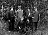 ELVA MÄN SITTER OCH SPELAR KORT I GRÄSET INTILL EN STENMUR.
