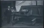 Baltiska utställningen i Malmö 1914. Gestriklands Hemslöjdsförenings rum. Furumöbler ritade av Mattis Hahr-Grundell och ryor vävda i Hofors under Hedvig Ulfsparres ledning.