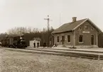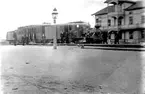 Skara station i början av 1900-talet. Vy från Järnvägsgatan. Vykort. Motivet är tecknat.