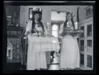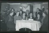 Gruppbild. Elever vid hushållsskola vid dukat bord med en granar på bordet, från början av 1900-talet.
