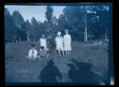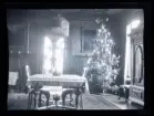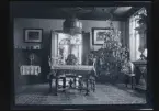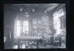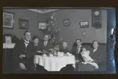"Axel, Frida, Ivar, Olle, Hilmer, Axels syster Hilda Vahlström Claes, Väsby" Sällskap samlat runt ett bord dukat med kaffekoppar. I rummet står en julgran.