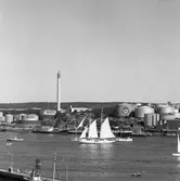 Bilden visar verksamhet ombord på skeppsgossefartyget Jarramas. Manskapet har klättrat upp på riggen och håller på att sätta eller bärga segel. Fotot är taget under något av åren 1940-talet, då fartyget var bemannat av elever från Sjömannsskolan.