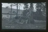 "Röjning för garagebyggnad vid Fogelstad, taget med självavtryckare." Paus i arbetet. Ett arbetslag poserar för kameran, fotograf Axel Fredriksson ståendes längst till höger i bild.