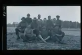 "Skogsplantering, Fogelstad." Grupporträtt av arbetslag. Axel Fredriksson näst längst till vänster.