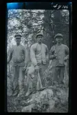"Far, Axel och Ivar borrar sten." Porträtt av tre män med släggor. Fredrik Vilhelm Eriksson till vänster, Axel Fredriksson i mitten.