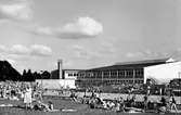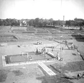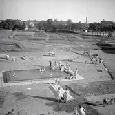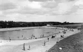 Sol och bad i plaskdammen vid Östergötlands museum en junidag 1950. Det egentliga skälet för bilden ses vid träden intill gångvägen. Den 4 maj 1950 hade runstenen påträffats i en åker på Kallerstads ägor öster om Linköping. Stenen låg fälld under jord, av allt att döma på ursprungligplats invid en viktig väg som gått över gärdena. På bilden har stenen fått ny plats i museiparken.