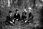 FEM VÄLKLÄDDA KVINNOR I SKOGEN.