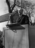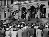 "Stor uppslutning i Upsala kring syttendemaifirandet" - professor Fredrik Paasche talar från universitetstrappan, Uppsala maj 1942