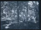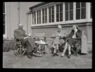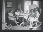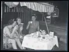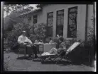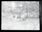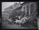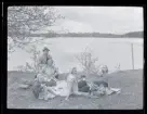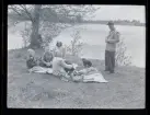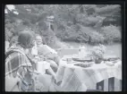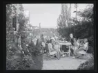 Ett sällskap vuxna och barn fikar utomhus.