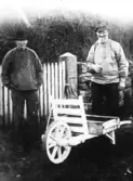 "Lia-Ludvig och Jans-Severin, två gamla fiskare från Morups socken, som är ute på landsbygden och säljer sin fångst 1920." De forslar fiskbacken på en målad "stolkärra". Mannen till höger håller i ett besman (våg) där ett knippe fiskar dinglar.