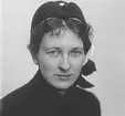 Porträtt av okänd kvinna med glasögon, håret stramt kammat bakåt. Vid halsen har hon brosch i form av en sköld och texten: Frälsningsarmén.