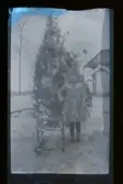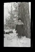 "Anna-Lisa 3 år" Fotografens dotter (kallad Anna-Lisa) Fredriksson står utomhus intill en julgran.