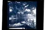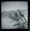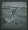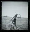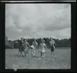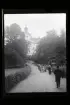 Människor på marknad/ tivoli. En man står på en scen, bakom honom en skylt som annonserar "svärdslukaren som förslök sig" och "muskelfenomenet Eskil Björk".