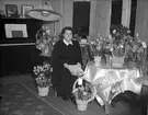 Kvinna med födelsedagsblommor i hemmet.::