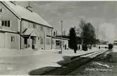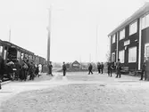 'Bildtext: ''Leksand navet.'' :: Gatuvy med husfasader skylt med texten ''Carl Kock rak och frisérsalong''. Vy med cyklar, män, kvinnor och e hög stång med kransar och i toppen vimpel. :: :: Ingår i serie med fotonr. 5234:1-12. Se även 5223:1-13, 5231:1-11 och 5232:1-8.'