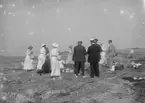 Från vänster: Erhard Nilsson, okänd, Ebba Wikström, okänd, Herman Eriksson. Sittande till höger i hatt: Målar-Emil Nilsson.