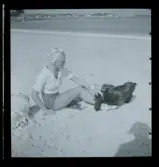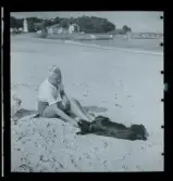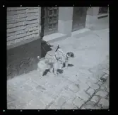 Två flickor i ljusa sommarklänningar (ansiktena utanför bild) med en vit katt i koppel. Fiskebäckskil, Bohuslän.