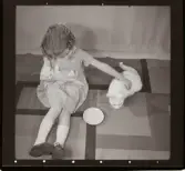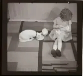 585/8 Facit Tokyo Daberg. Ett barn i kimono med en katt i famnen.