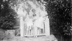 Enligt notering: "Familj vid bikuporna framför huset, Anna Olsson, Algot Torevi, Rut, Astrid".