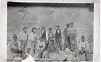 "6 sjuksystrar vid bergets fot." De står i ett stenbrott i Kustsanatoriets närhet vid någon anordning med stolpar, rep och talja. Se även bildnr KSA98 och KSA100,102.