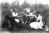 Åsmundshyttan 5:4, "Erik-Daniels". Stående från vänster Elsa Åsberg-Kling, Edit Åsberg-Norling, Olga Charlotta Åsberg f. 4 december 1888 d. 9 mars 1929. Sittande från vänster Karin Jansdotter f. 21 december 1847 d. 22 september 1925, Anders Olson-Åsberg f. 19 mars 1849 d. 12 augusti 1924, Anna Johansson f. 15 september 1888, Karl Johansson, Lars Gustav Åsberg f. 28 juli 1880 d. 28 november 1960, Johan Johansson, Tea Johansson, Birger Pfeifer f. 8 september 1860, Andrea Pfeifer f. 10 januari 1884. Karl och Johan är bröder. Karin och Anders, Anna och Karl, Olga och Lars, Johan och Tea är gifta par. Uppgifter lämnad av Margit Karlsson.