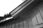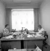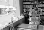 "Kunden Henny Nilsson från Ljungskile vid skyltfönstret vid norra gaveln. Henny brukar handla mycket här. "En trevlig affär för allt möjligt". På bilden syns också Nils Antonsson"