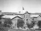Skioptikonbild med motiv av hus vid stranden i Båstad. Bilden har förvarats i kartong märkt: Höstresan 1907. Båstad 7. N: 1