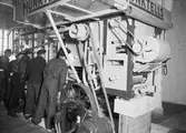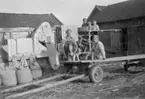 Tröskning i Ågård, Tvååker. Tröskning med fotogenmotor s k tändkulemotor, 1910. Tröskfolket, med barn och vuxna, är samlat omkring maskineriet. På väggen till ladan bakom folket sitter ett stort anslag.