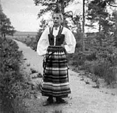 Akvarellerad handteckning av J W Wallander. Kvinnodräkt från Äppelbo, Dalarna. Text: "Äppelbo. Sorgdräkt". Nordiska museets inventarienummer 57339b.