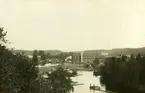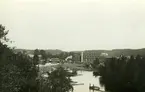 Frånö Cellulosafabrik vid Ångermanälven. Bogseraren "Rosse" med timmergrimman utanför Frånö.