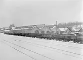 Två Hilding Carlsson -rälsbussar från mitten till vänster samt tillhörande släp i mitten på fotot.