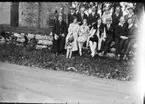 Gruppfoto av några beväringar i sällskap med tre unga damer.