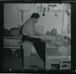 Textilindustri. En kvinna hanterar tråd i en vävmaskin. Dokumentation av Slitmanfabriken ABs verksamhet.