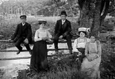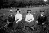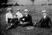 TRE MÄN OCH TVÅ KVINNOR SITTER OCH FESTAR I GRÖNGRÄSET