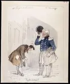 "W. Troyon de Lausanne. A. Ehrenhoff. Fause Antiquité". En man bugar djupt för en annan man i uniform. Av Fritz von Dardel
