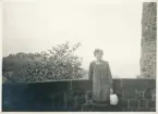 "Gretchen" på Wartburg". Margareta Bergstedt (g. Lidén), i klänning och med hatt i handen poserar vid en mur på borgen Wartburg, där Martin Luther bodde i början av 1520-talet.