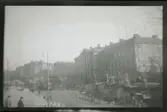 Nya cementplattor under utläggning på Norrmalmstorg. Vy mot husen vid torgets östra sida.