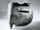 "Info från fotobeskrivning" "Glaserat defekt lerkärl med större fyrkantig öppning och fyra ben, två skänklar. Högra sidan dekorerad med centrumknapp."
