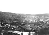 Vy på stationsområde och bangård med hus, resande och väg i bakgrunden.