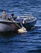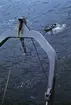 Övning i fri uppstigning. En dykare når ytan efter uppstigning från 20 meters djup. Vänster hand i gardställning för att ej slå huvudet i något föremål.