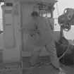 Text till bilden: "Däckbild på Ångaren. Två från vänster S. P. Pettersson. I stolen ev kapten Thorburn".