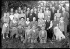 Fru Linnarsson, Torpomad, Götlunda socken, med sina vuxna barn på sin sjuttioårsdag bland blommor och presenter.