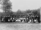 Text till bilden:"Föreningsmedlemmar i olika åldrar. Barnen som sitter närmast kameran är klädda i föreningens speciella kläder (Blå Bandet)".