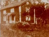 Exteriör. Bostadsmiljö. Trähus byggt i vinkel, bostad för flera familjer. En kvinna med ett barn och en barnvagn har just kommit in genom dörren i planket. Entrén till bostaden i mitten, har en förstubro med snickarglädje. I trädgården/på innegården finns flera träd. Möjligen är det en jordkällare till vänster i bild. Fotografens anteckning: Dokumentation av fastigheter i kvarteren söder och norr om ån. Bilder och beskrivningar finns på Arboga museum.