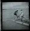 539 Söder. Två unga män sitter på gatan i en korsning, lutade mot ett staket.